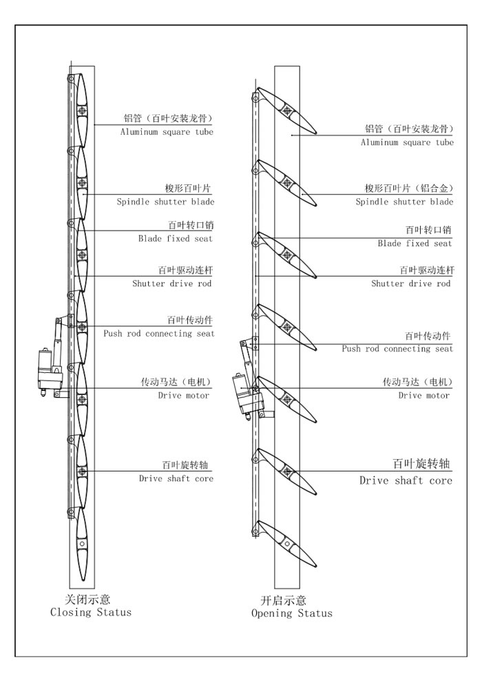 Hollow structure designed, spindle blade with double cambered surface, high strength and large span. Reach sunshade, lighting, embellishment used on glass curtain wall. Powered by linear actuator to run the blades.